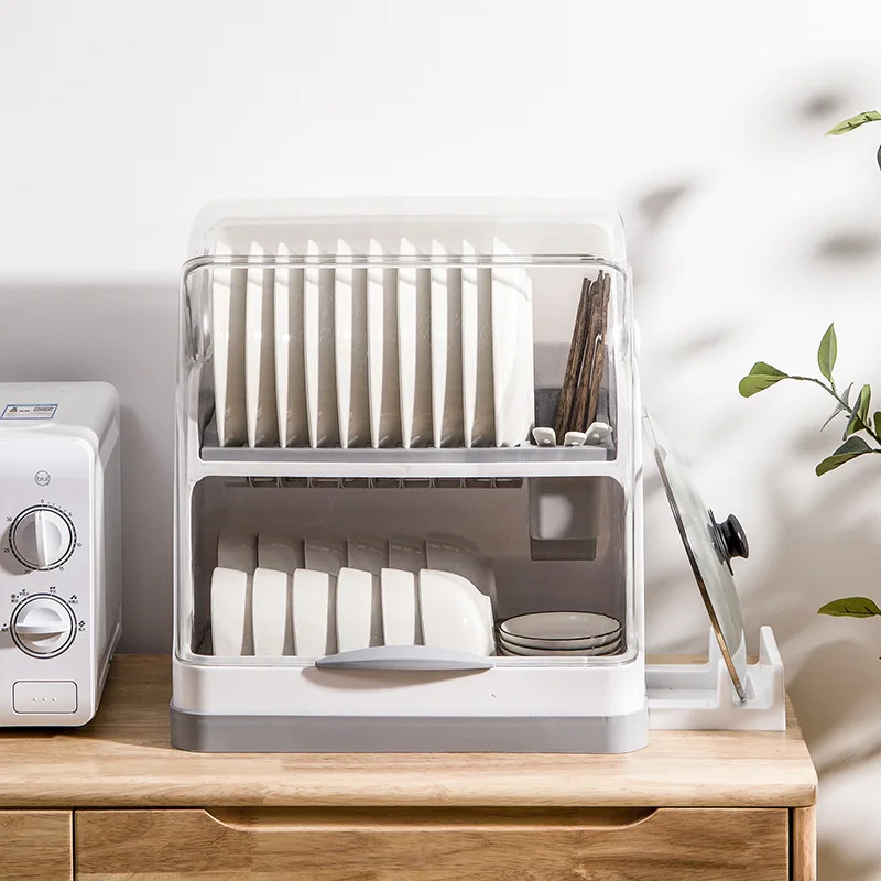 - Double-layer large capacity kitchen organizer dust-proof bowl dish storage racks with cover strip hollow drain design shelf