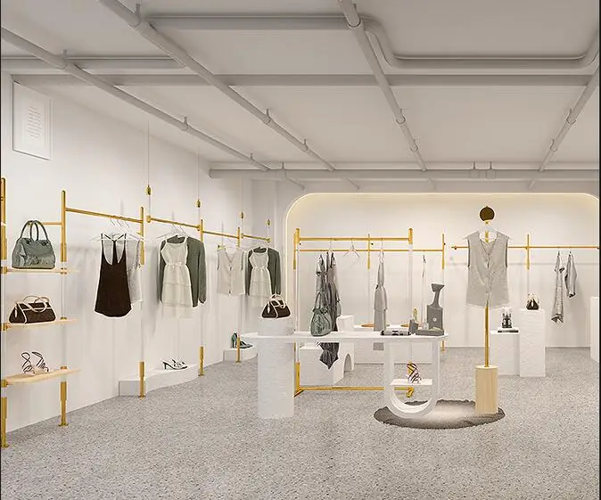 - Women's clothing store stainless steel display rack golden clothes hanger acrylic column design landing Island shelf simple