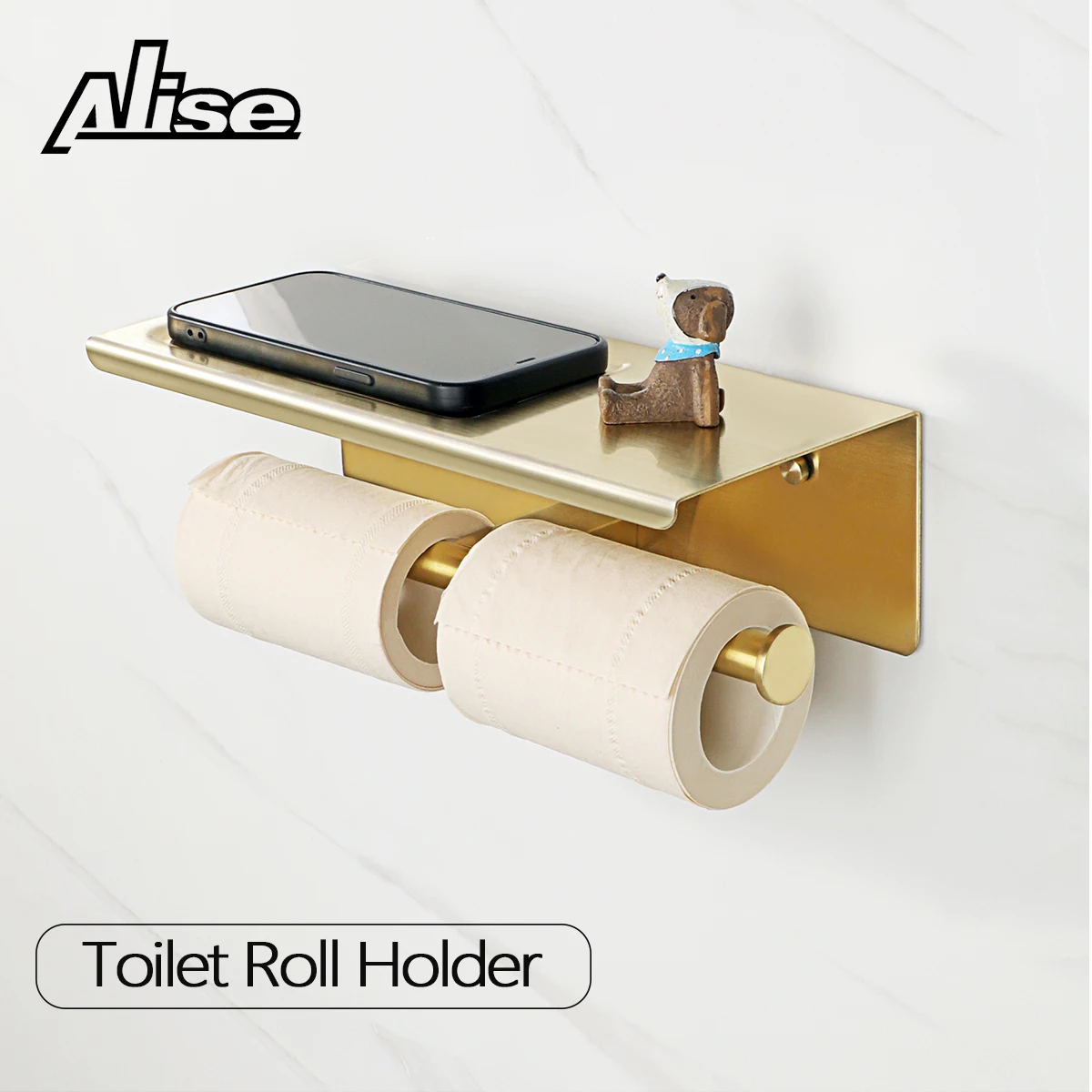 - Double Toilet Paper Holder Roll Holder with Storage Shelf,304 Stainless Steel Golden Finished, No Drilling Bathroom Hardware
