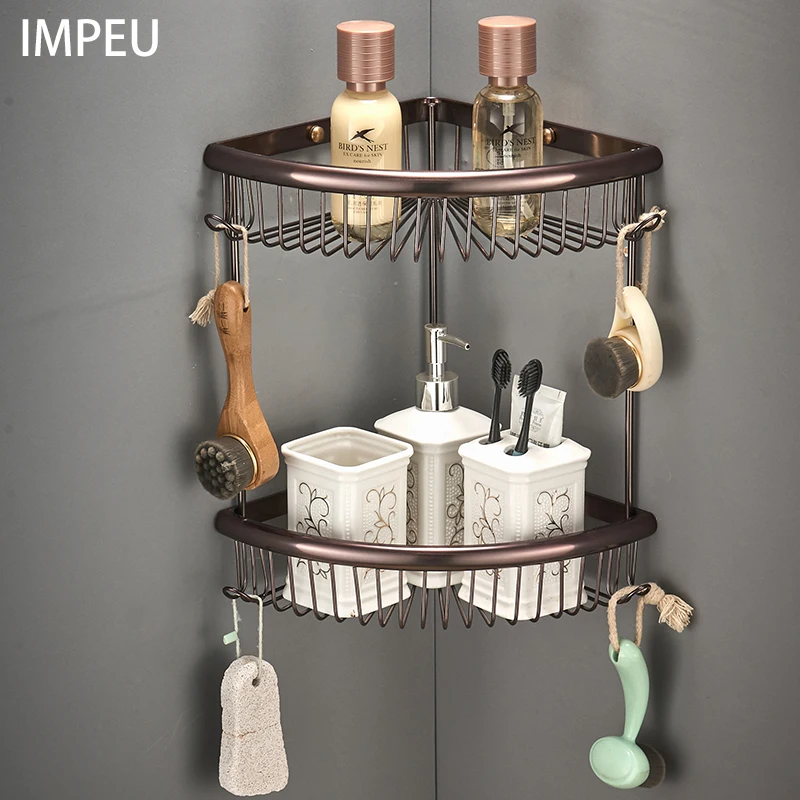 - 2 Tier Corner Shelf Storage Organizer with Towel Hooks, Idea for Kitchen and Bathroom, Shower Basket, Solid Brass Material